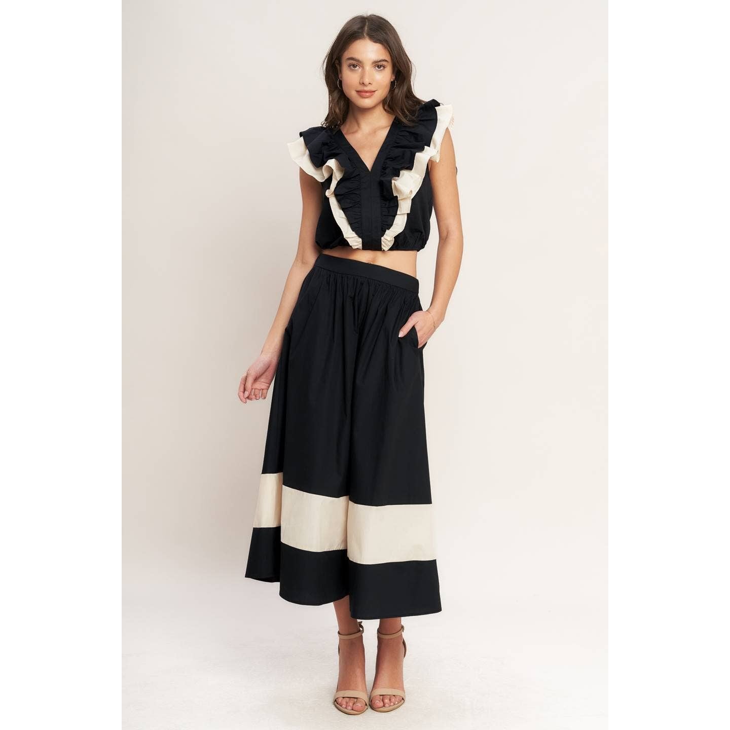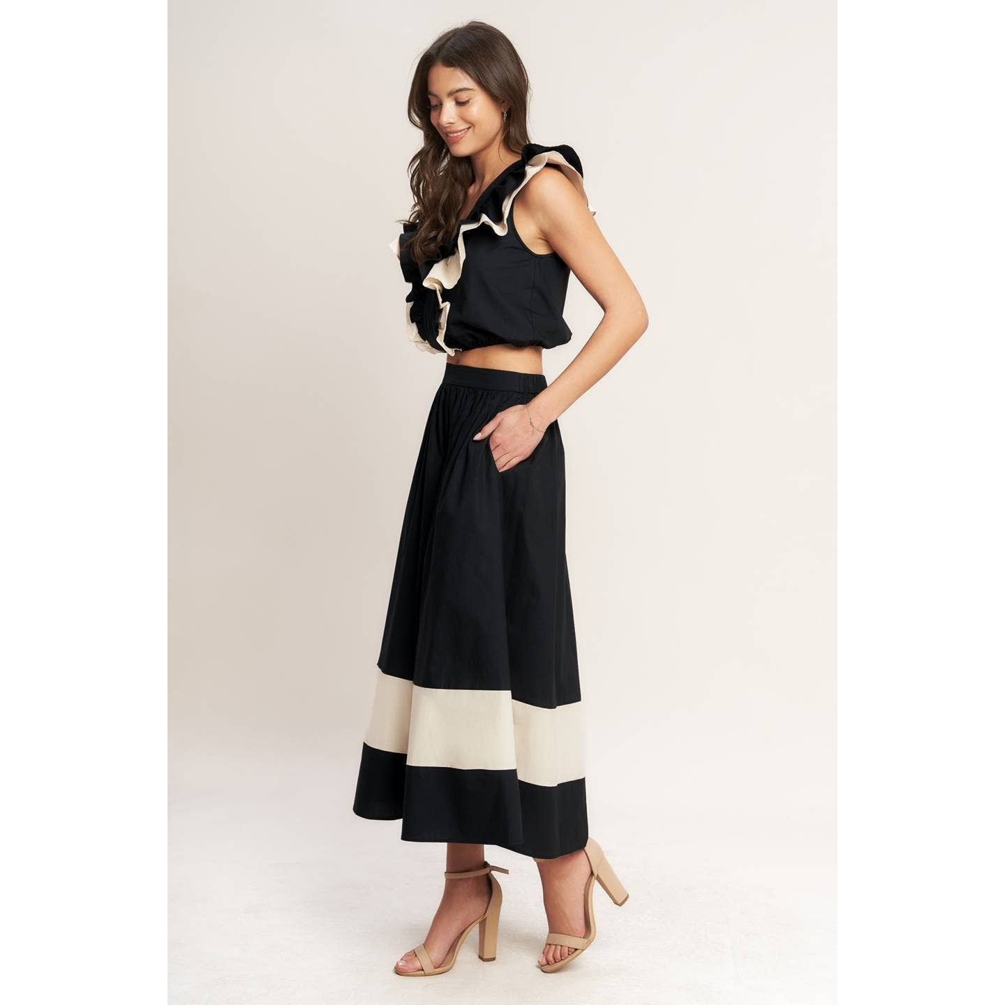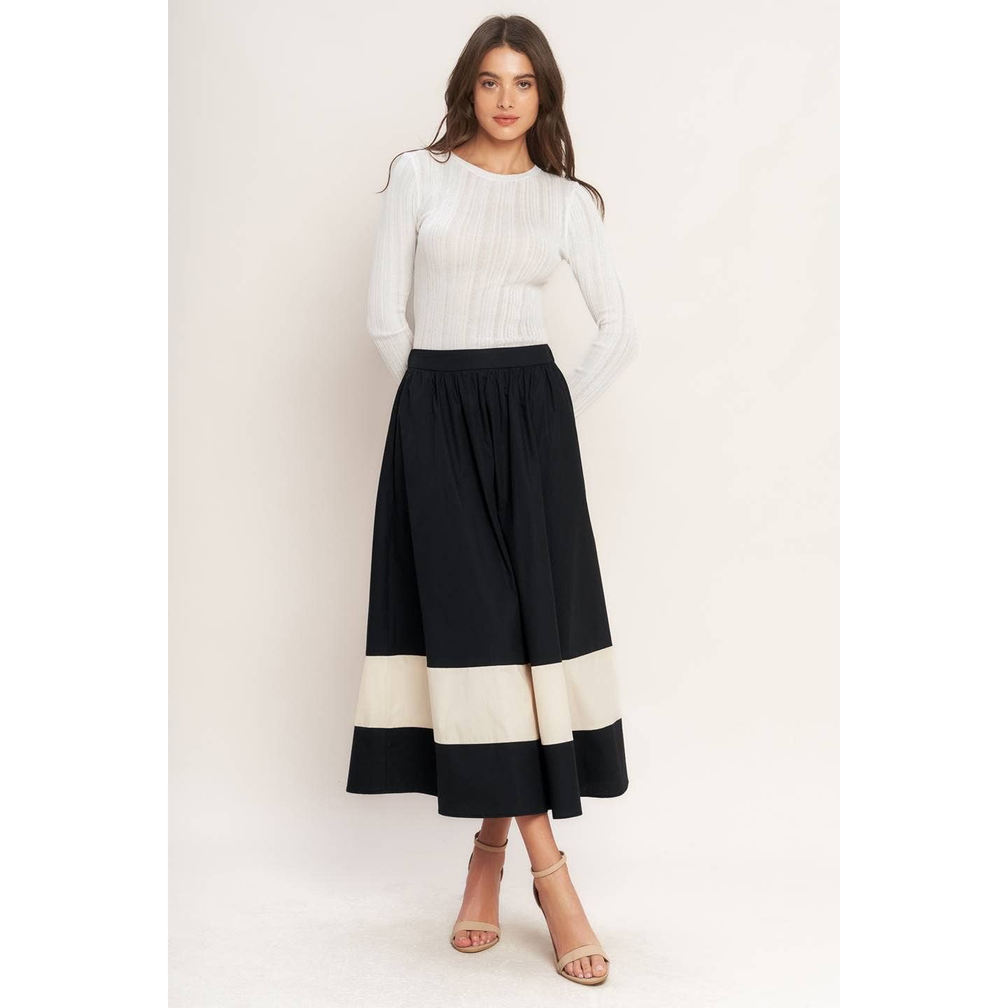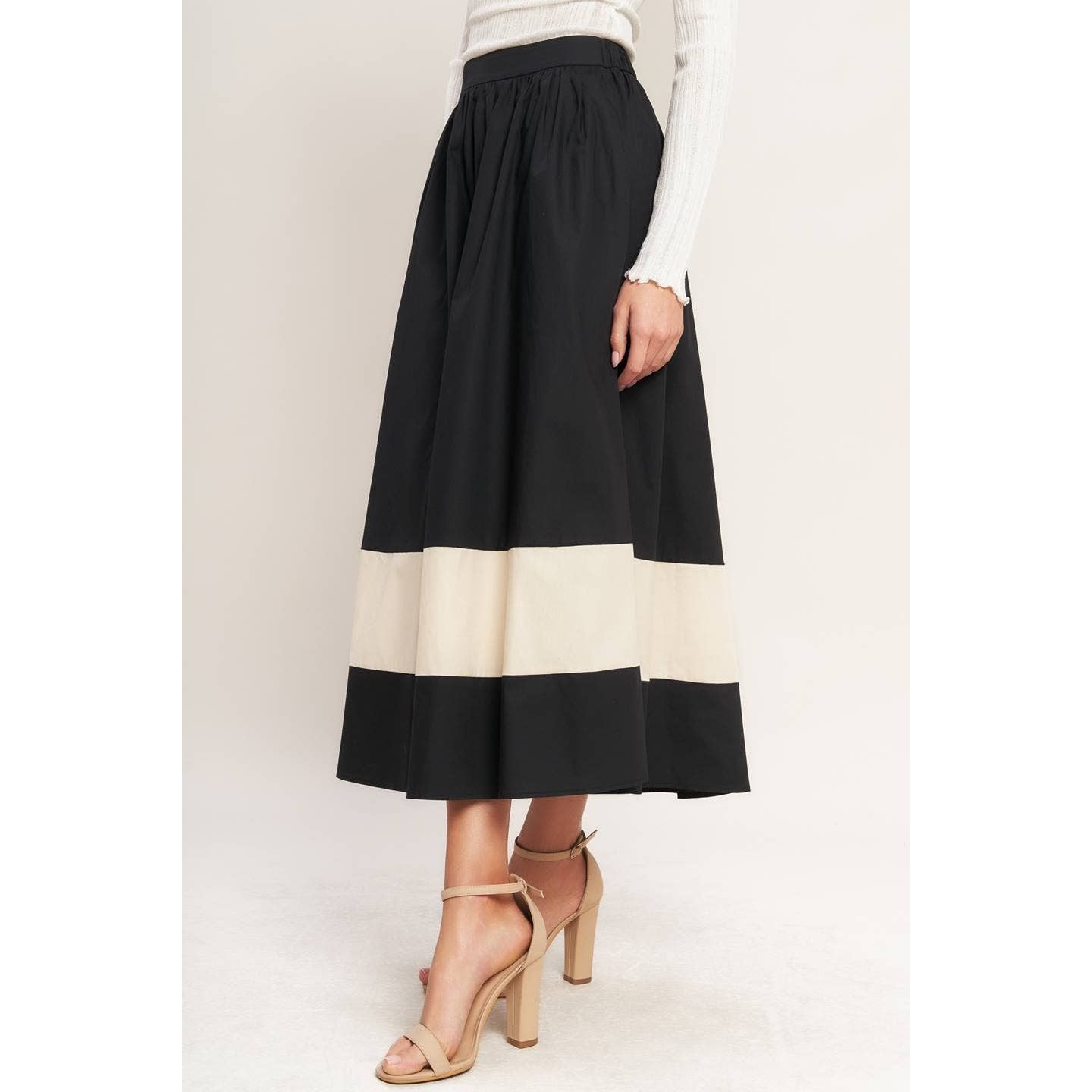 A solid color blocked full midi skirt with a comfortable elastic wasitband and pockets.