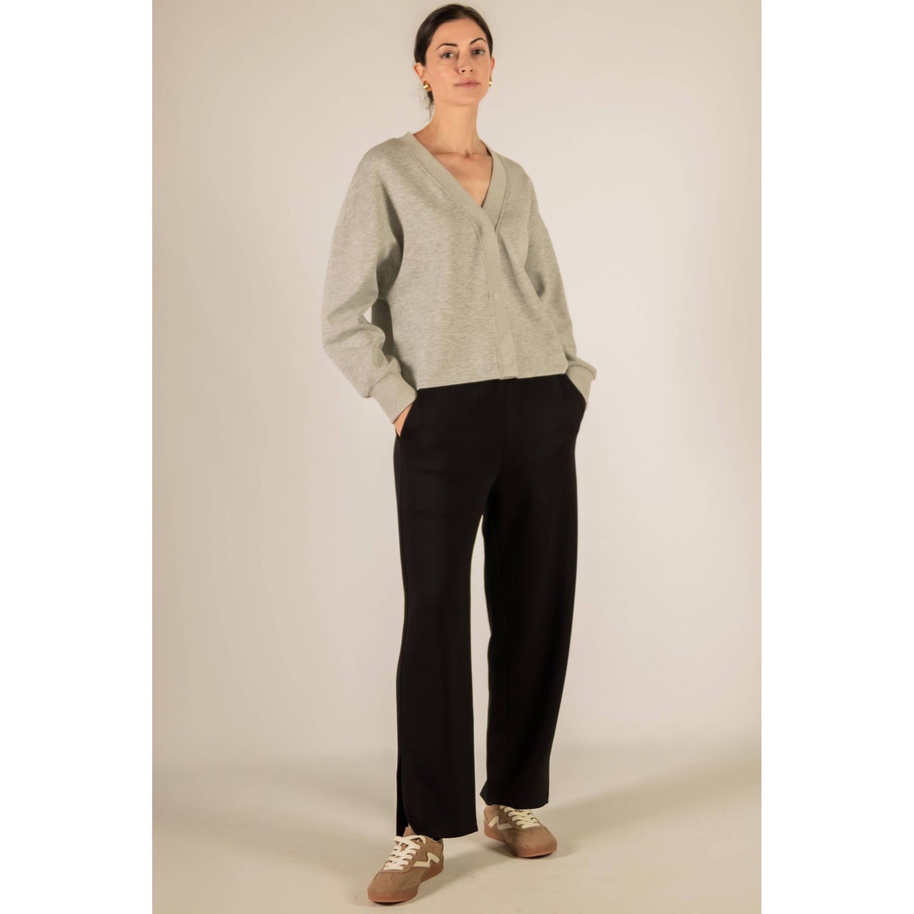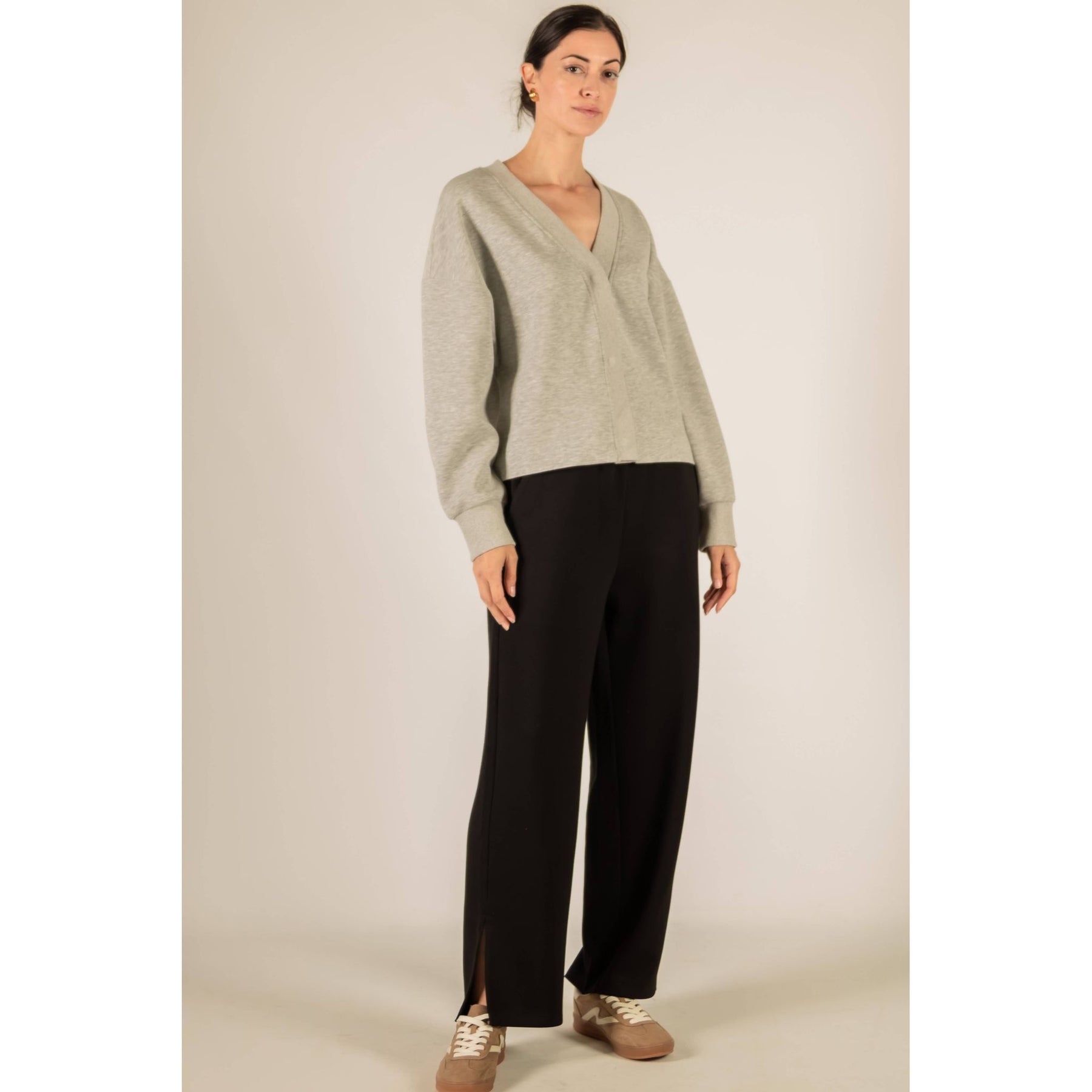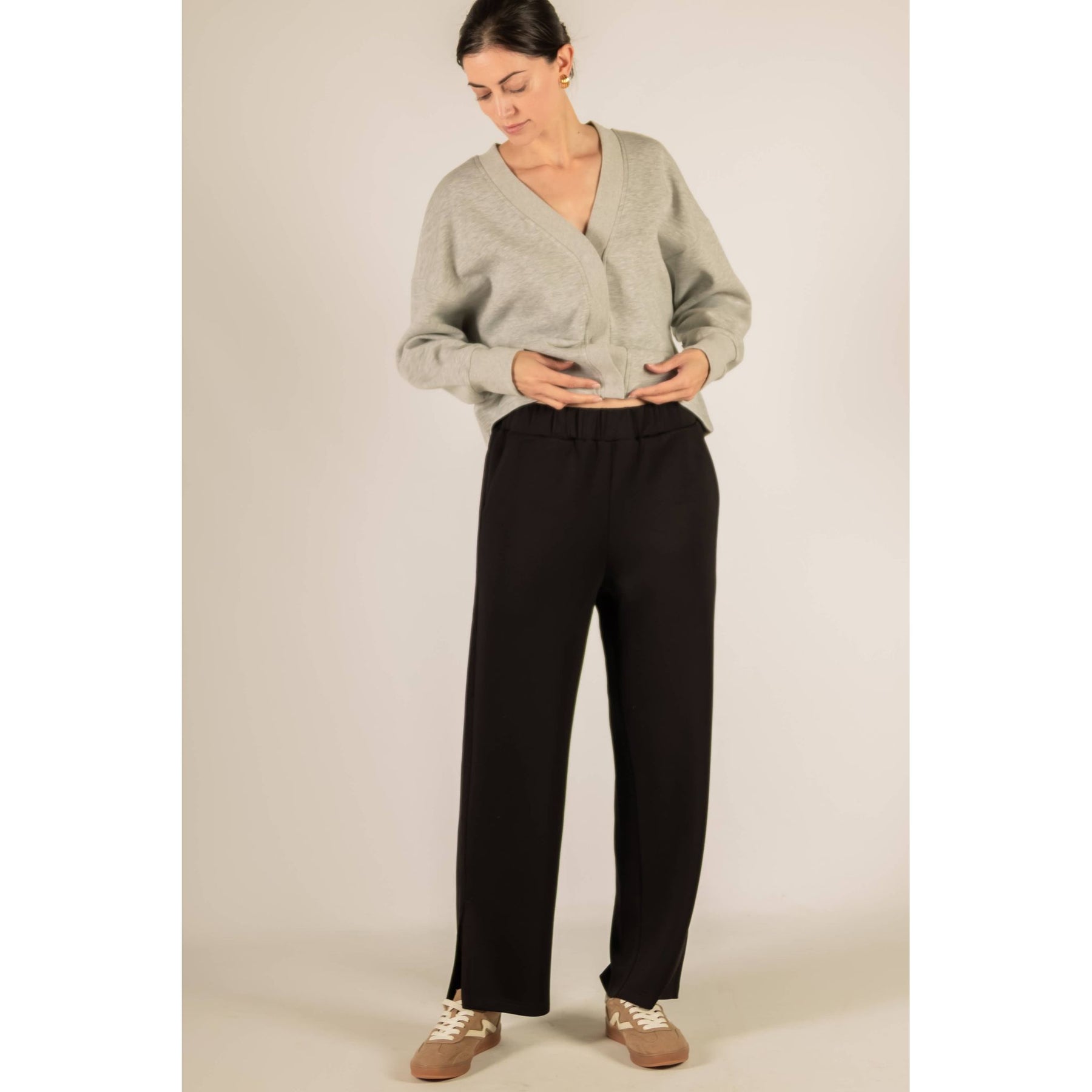 These wide leg pants deliver a sleek yet relaxed fit. Designed with a smooth pull-on waistband and subtle bottom slits, they offer effortless movement and a touch of modern detail.