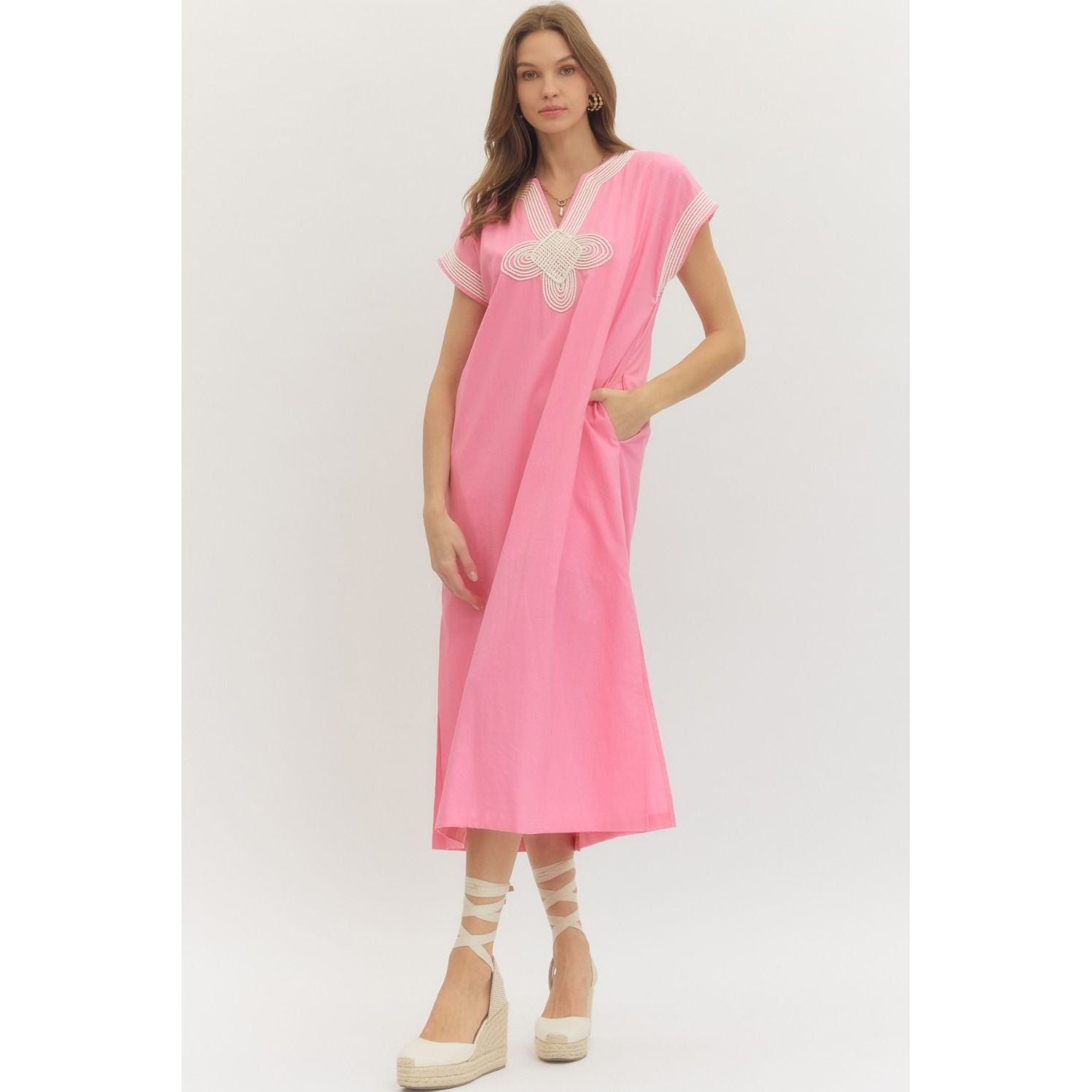 Designed in a vibrant, mood-lifting pink, this relaxed silhouette drapes beautifully with a lightweight, breathable feel. The standout detail: a delicate embroidered neckline that adds just the right touch of artisanal charm. Subtle structure through the shoulders keeps the shape refined, while the easy, straight fit makes it endlessly wearable.