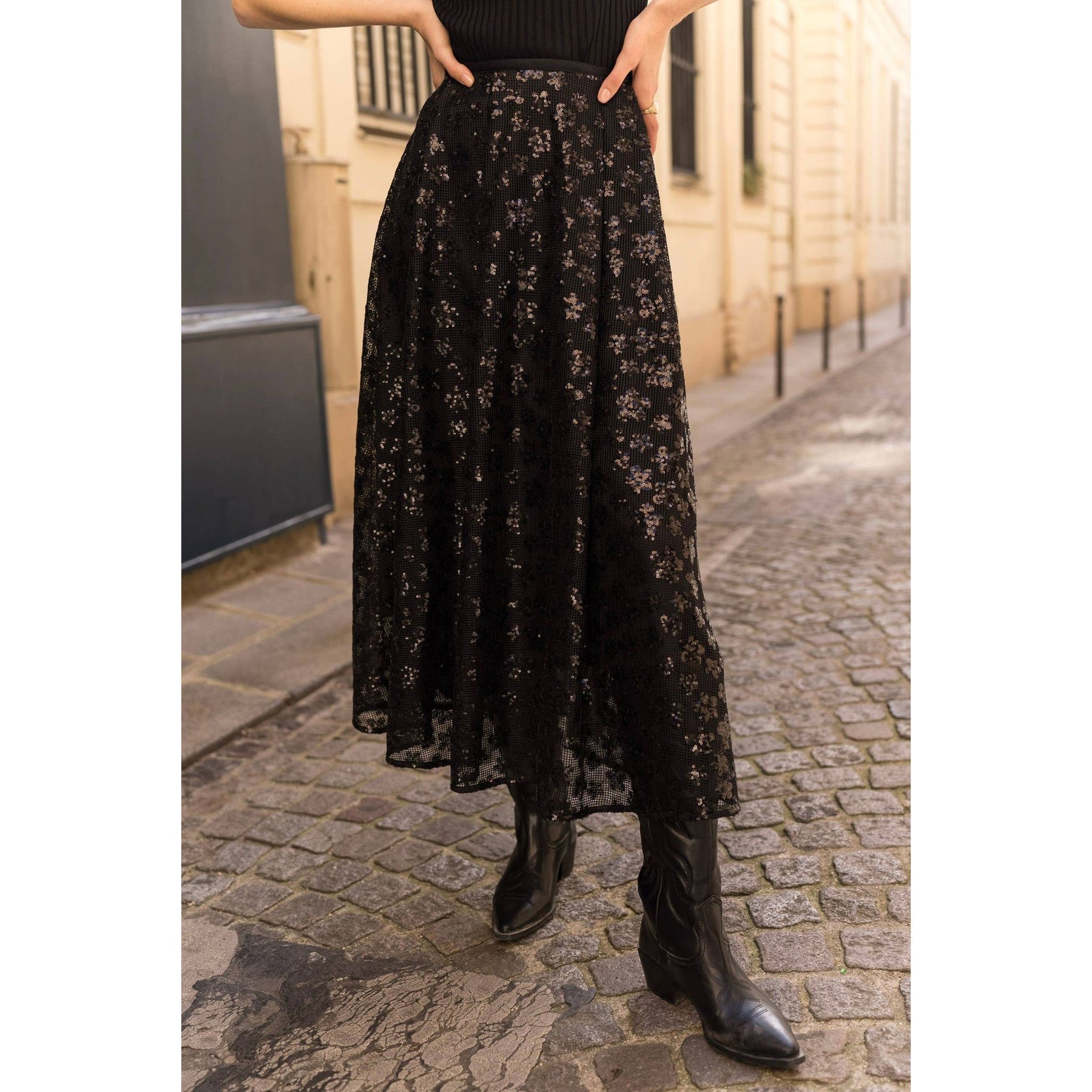 Maxi skirt with flower-shaped embroidered sequins. Has a side zip and beautiful understated sparkle.