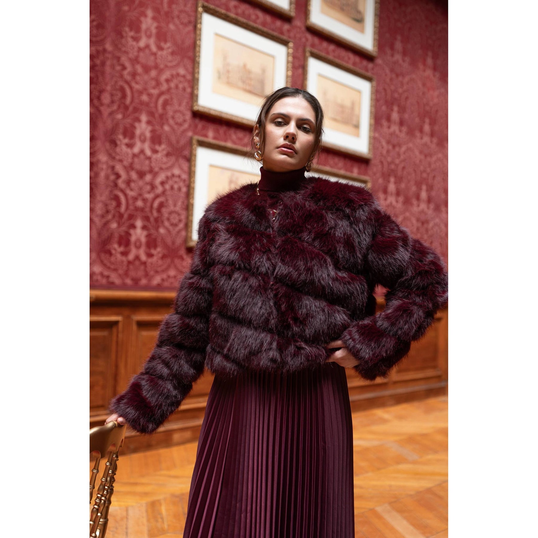 Short faux fur jacket in a luxe deep wine color. Hits at waist, has pockets and front closure.