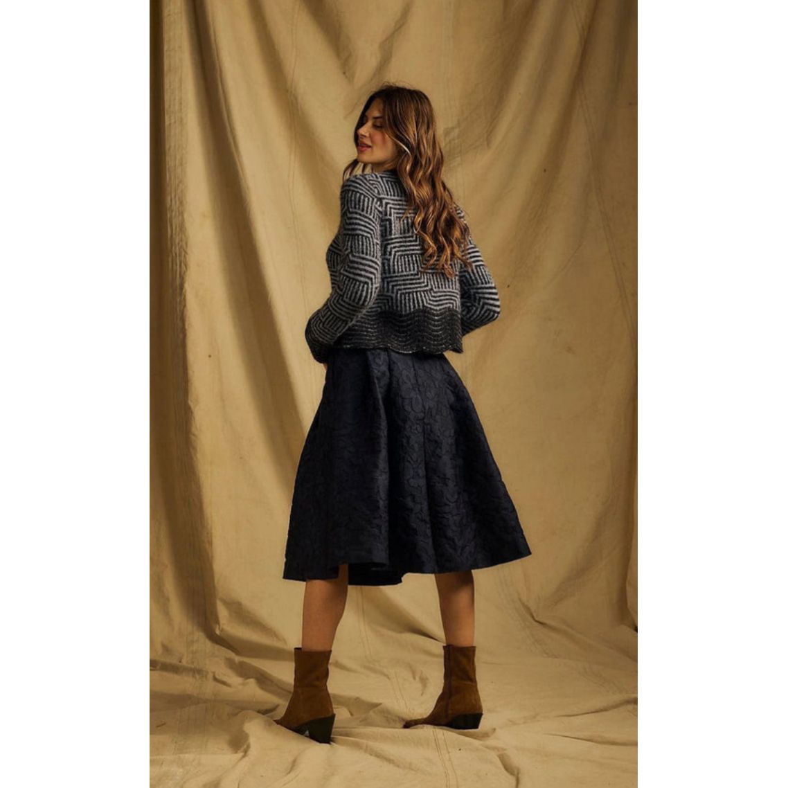 This crewneck textured sweater in maritime blues features a fun geometric pattern. Scallop edges at the neck, waist, and sleeves add a special detail. It can be styled simply with a pair of jeans for a relaxed fit.