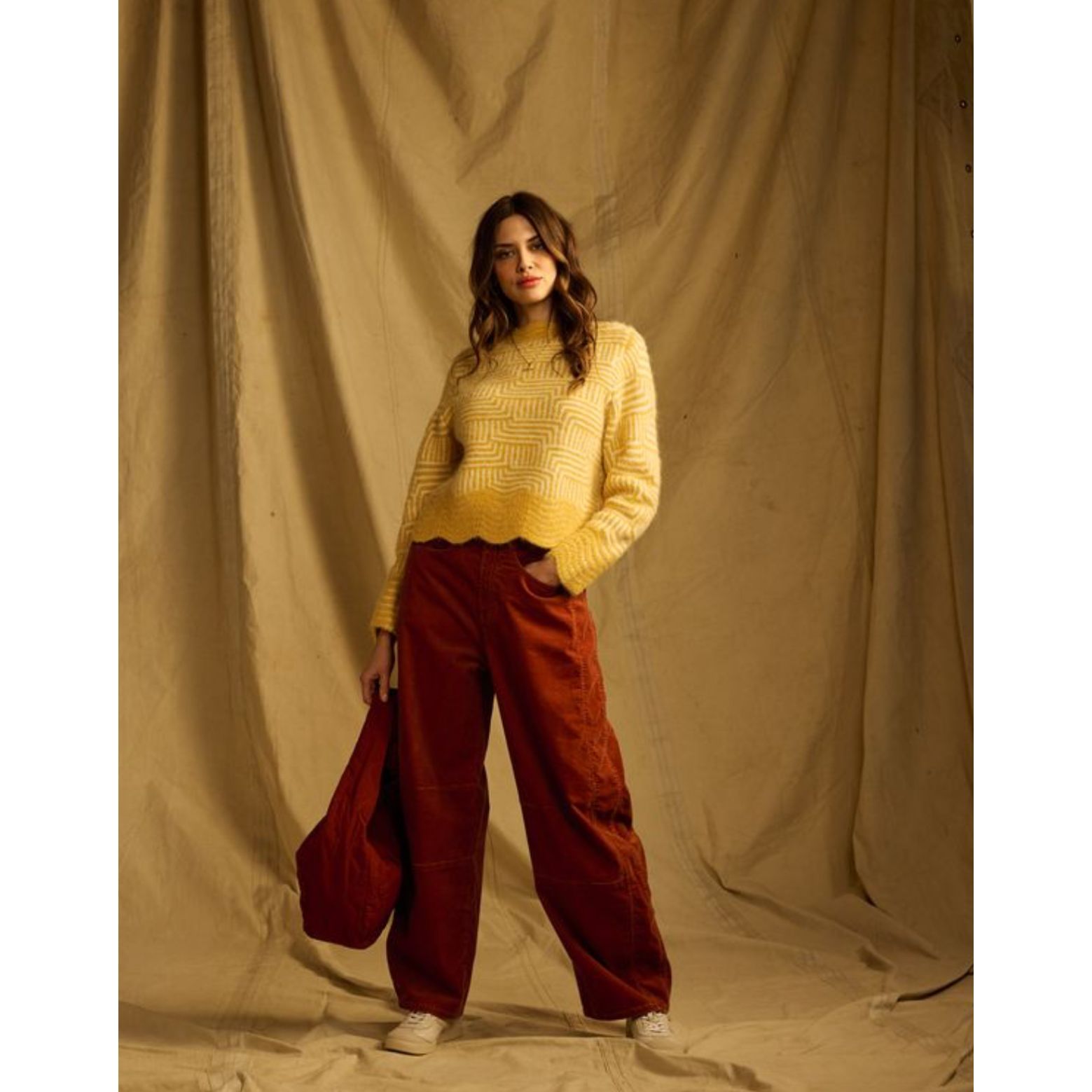 This crewneck textured sweater in mustard and white features a fun geometric pattern. Scallop edges at the neck, waist, and sleeves add a special detail. It can be styled simply with a pair of jeans for a relaxed fit.