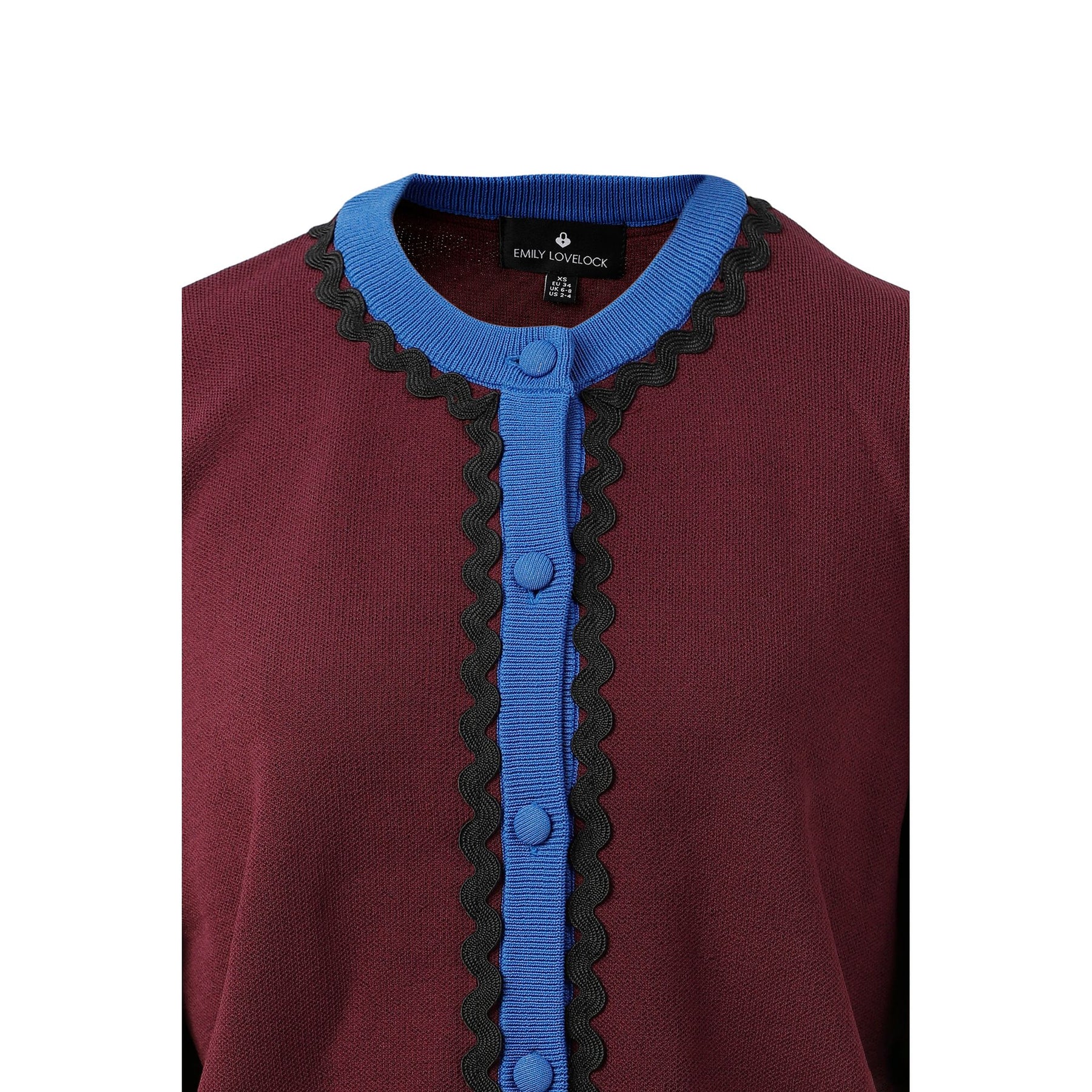 The Diana Cardigan by Emily Lovelock is a customer favorite. The sweater features a crew neckline, long sleeves, and fabric buttons up the front. The Tanny Port and Electric Blue color combo color combination and rick rack trim make this cardigan a one of a kind piece to add to your wardrobe.