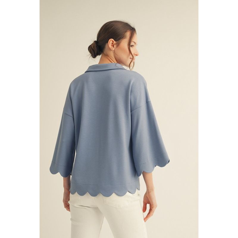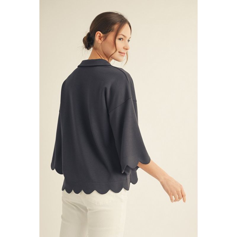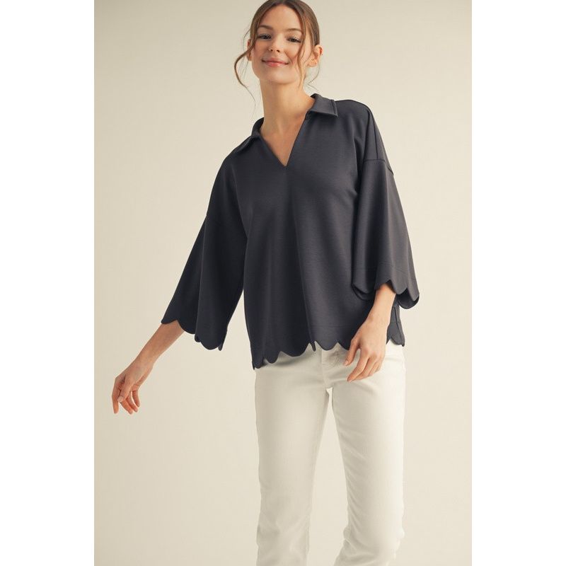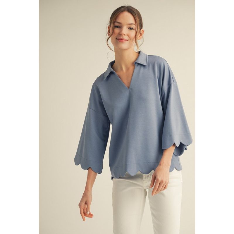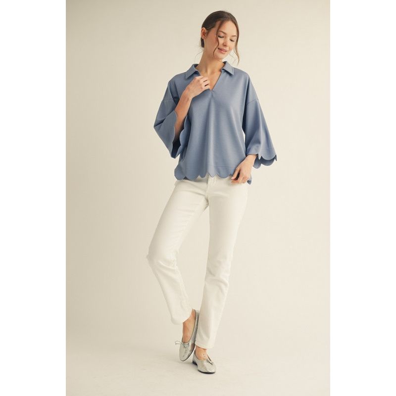 An easy top to add to your wardrobe with scallop detail at the sleeve and hem. The collar with open neckline is flattering paired with jeans, pants, and skirts.
