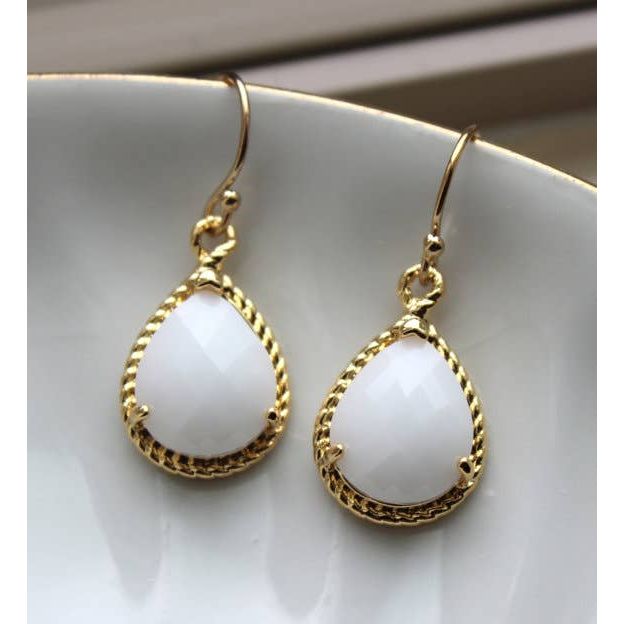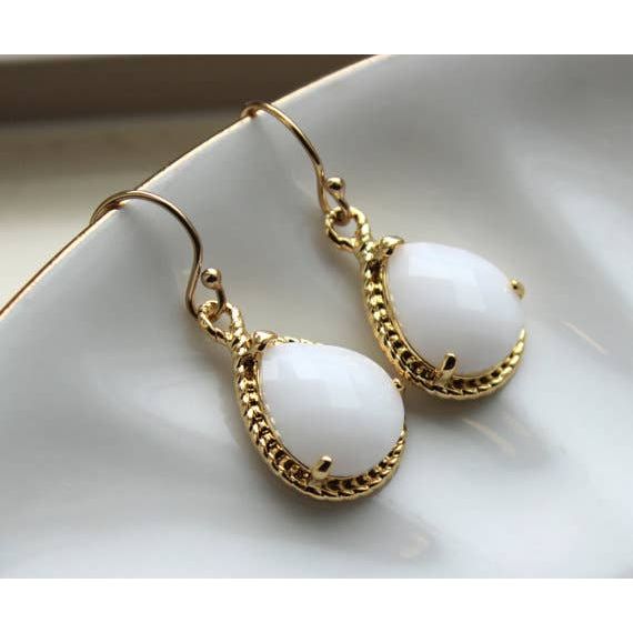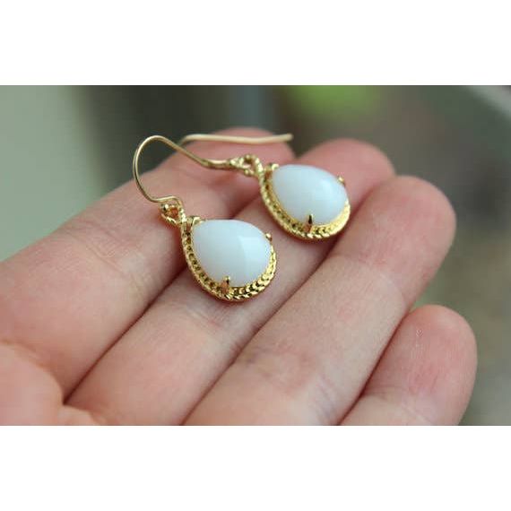 These earrings are simply stunning! You are sure to stand out in these beautiful earrings! The white opal teardrop measures overall 19mm by 12mm (including the loop). The glass in the middle of the teardrop measures 13mm by 10mm by 6mm. The ear wires are 14k gold filled.